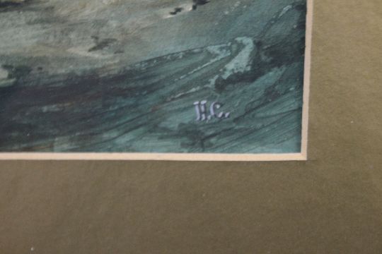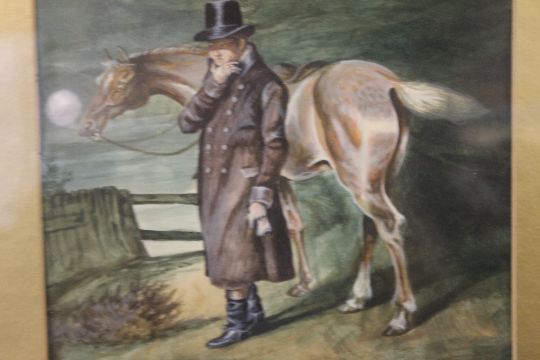 A 19TH CENTURY PAINTING OF A MAN WITH A HORSE, INITIALED H. C. LOWER RIGHT, FRAMED AND GLAZED, 38 X 47 INCLUDING FRAME