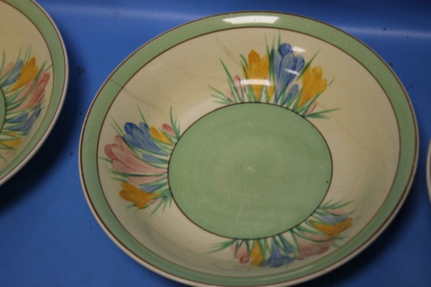 NINE CLARICE CLIFF BOWLS SOME CHIPPEDCondition Report:  All of the bowls have wear and scratches to the central section.  All have crazing to the glaze.  Six do not have chips or cracks