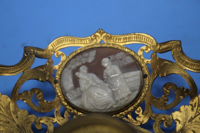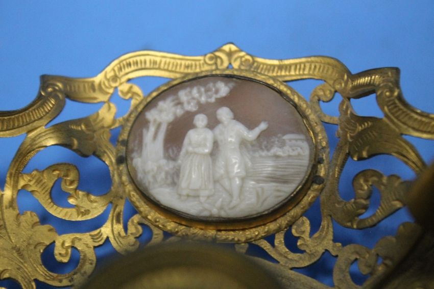 A GILT METAL CANDLE HOLDER WITH CAMEO INSETS AND A CANDLE SNUFFER