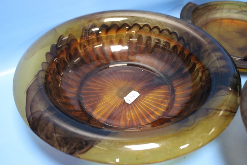 SIX PIECES OF DAVIDSON BROWN CLOUD GLASS TO INCLUDE CANDLE HOLDERS, AND TWO BOWLS WITH STANDS