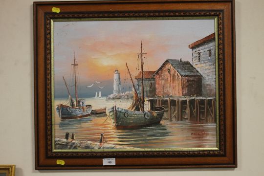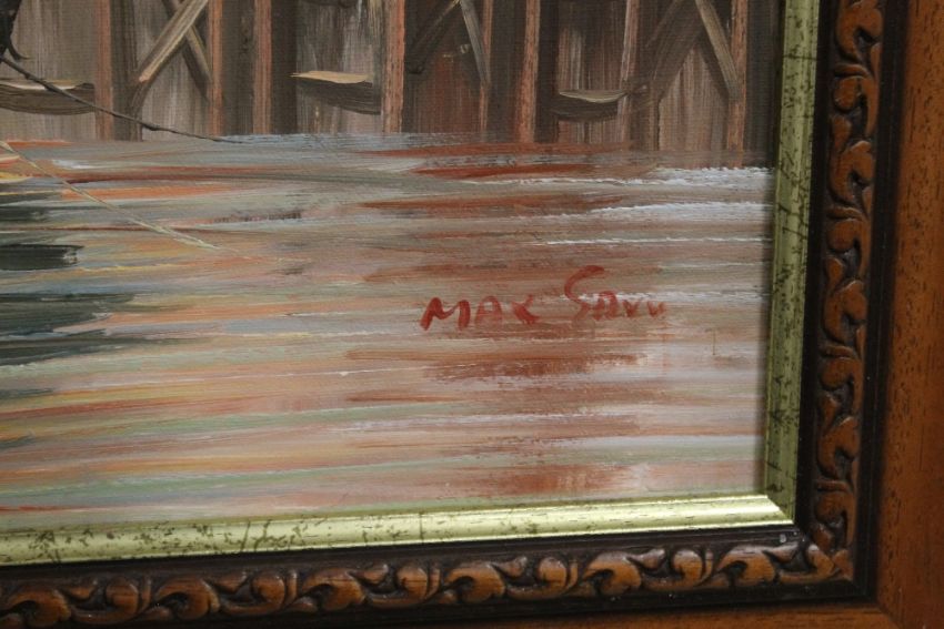 MAX SAVY, A FRAMED OIL ON CANVAS OF A HARBOUR SCENE, 63 X 52 CM