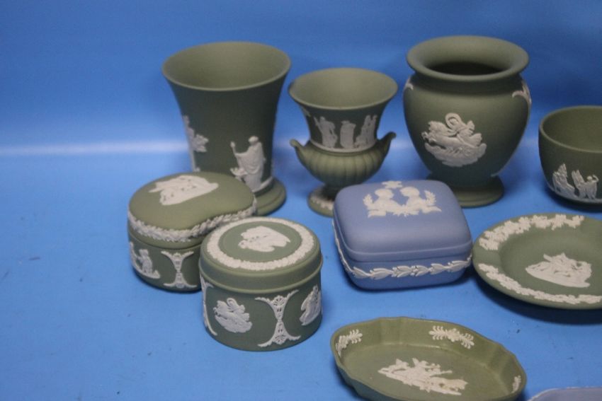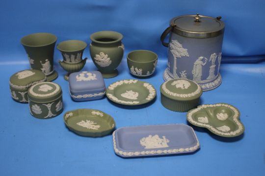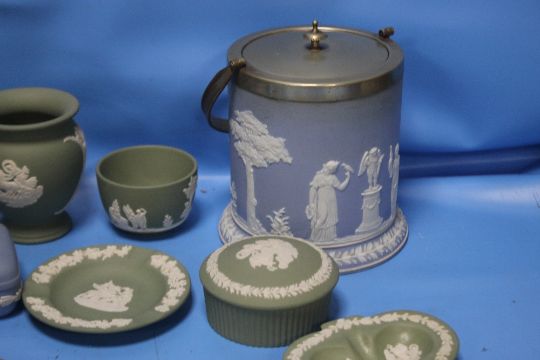 A COLLECTION OF WEDGWOOD GREEN AND BLUE JASPERWARE TO INCLUDE A LIDDED BARREL