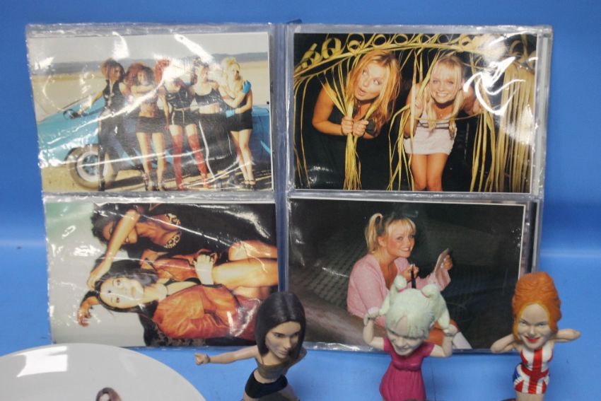A COLLECTION OF SPICE GIRLS MEMORABILIA TO INCLUDE PHOTOGRAPHS, A PLATE AND FOUR FIGURES