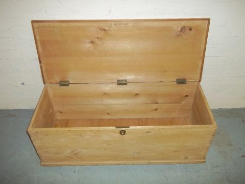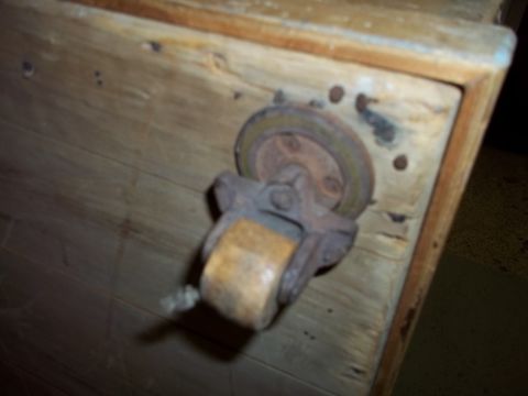 A WOODEN STORAGE BOX CHEST ON WHEELS