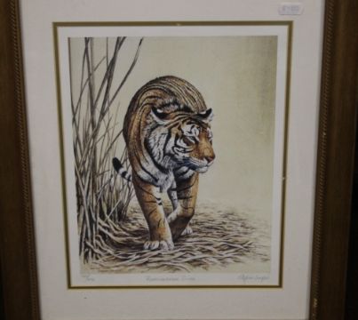 A FRAMED LIMITED EDITION PRINT OF A TIGER SIGNED STEPHEN GAYFORD, APPROX. 41 X 50 CM