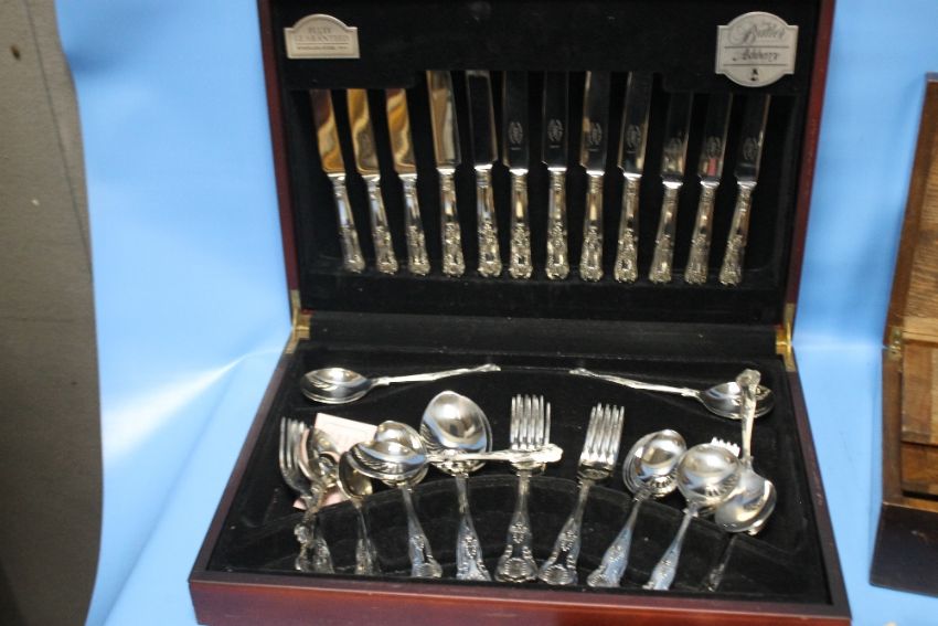 A CASED CANTEEN OF CUTLERY TOGETHER WITH A WRITING SLOPE A/F ETC.