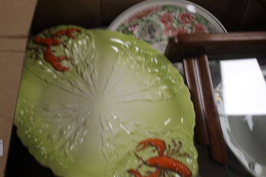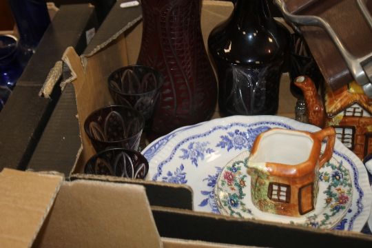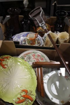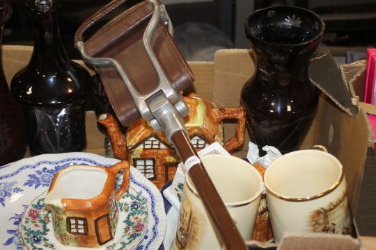 TWO TRAYS OF CERAMICS ETC. TO INCLUDE CARLTONWARE, A PAIR OF ARTHUR WOODS JUGS, A SHOOTING STICK ETC.