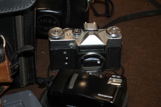 VINTAGE CAMERAS AND LENSES TO INCLUDE MIRANDA, ZENIT-E, KODAK EK160, CARRY CASE ETC.