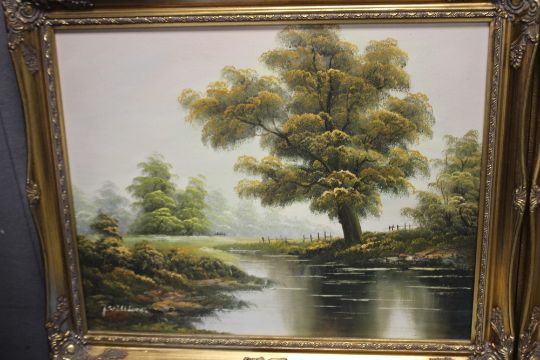 THREE FRAMED OIL PAINTINGS DEPICTING RIVERSIDE SCENES