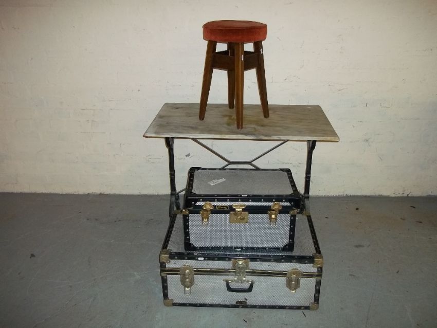 A MARBLE TABLE WITH CAST IRON LEGS, PUB STOOL AND TWO STORAGE CASES
