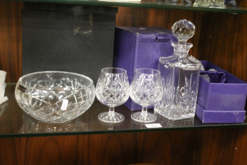 A COLLECTION OF BOXED GLASS TO INCLUDE EDINBURGH CRYSTAL AND THOMAS WEBB, DECANTER, FRUIT BOWLS AND DRINKING GLASSES