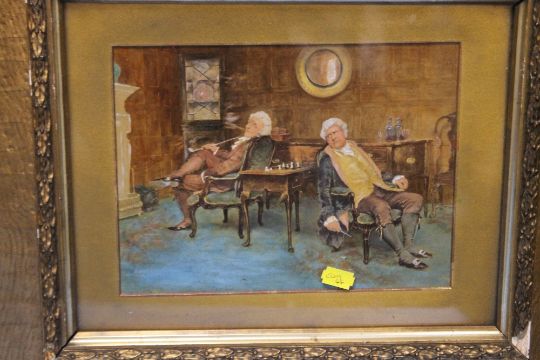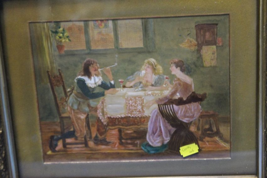 A. SCHRODER - PICTURE OF A MAN AT A TABLE SMOKING A PIPE ALONG WITH TWO LADIES AND ANOTHER SIMILAR PICTURE, FRAMED AND GLAZED, 47 X 40 CM (2)