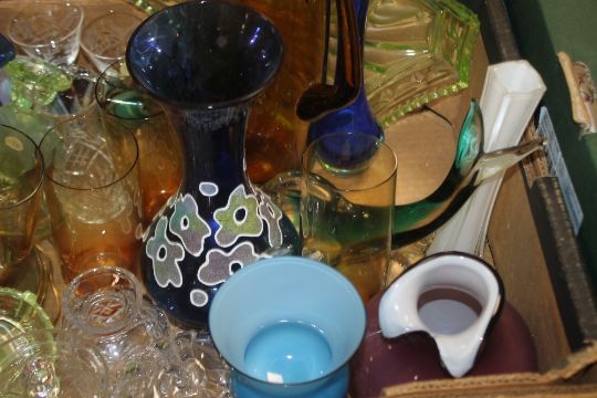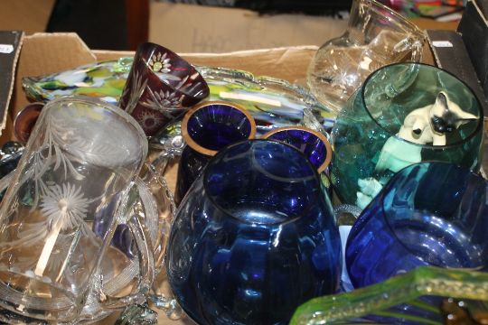 TWO TRAYS OF GLASSWARE TO INCLUDE BLUE GLASS, MURANO STYLE GLASS FISH, CAT AND MOUSE BRANDY GLASS ETC.