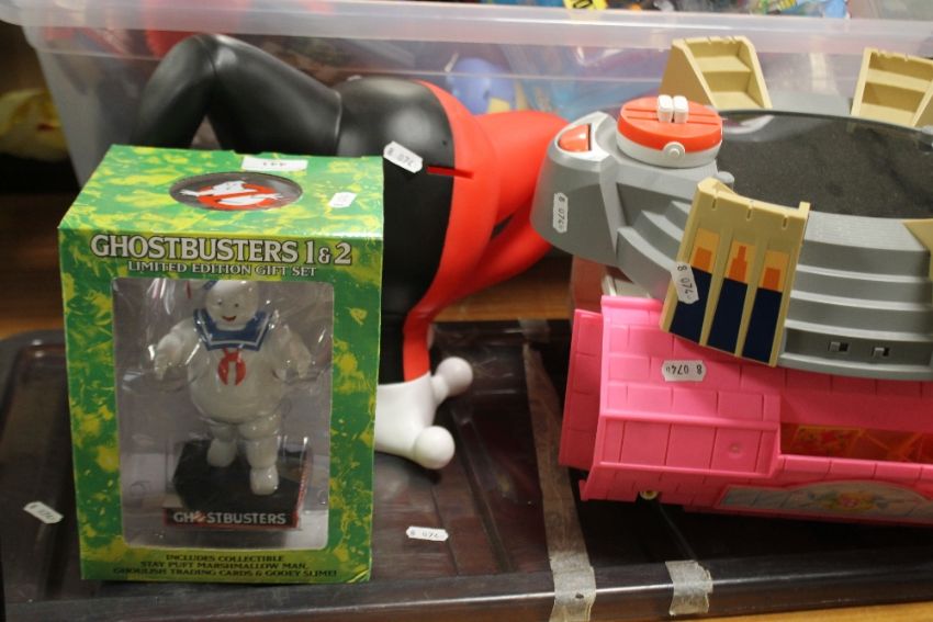 A QUANTITY OF ASSORTED CHILDREN'S TOYS AND GAMES TO INCLUDE ELMO, GHOSTBUSTERS LIMITED EDITION MARSHMALLOW MAN ETC.