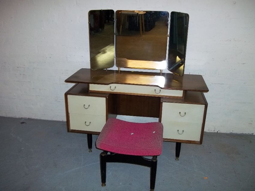A G-PLAN TRIPLE MIRROR VINTAGE DRESSING TABLE AND STOOL
