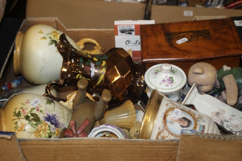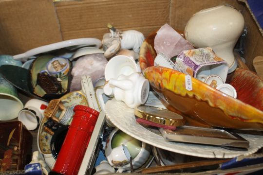 THREE TRAYS OF SUNDRIES TO INCLUDE CERAMICS TOGETHER WITH A TRAY OF SOFT TOYS ETC.