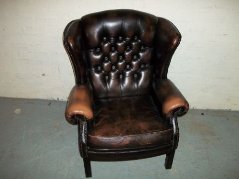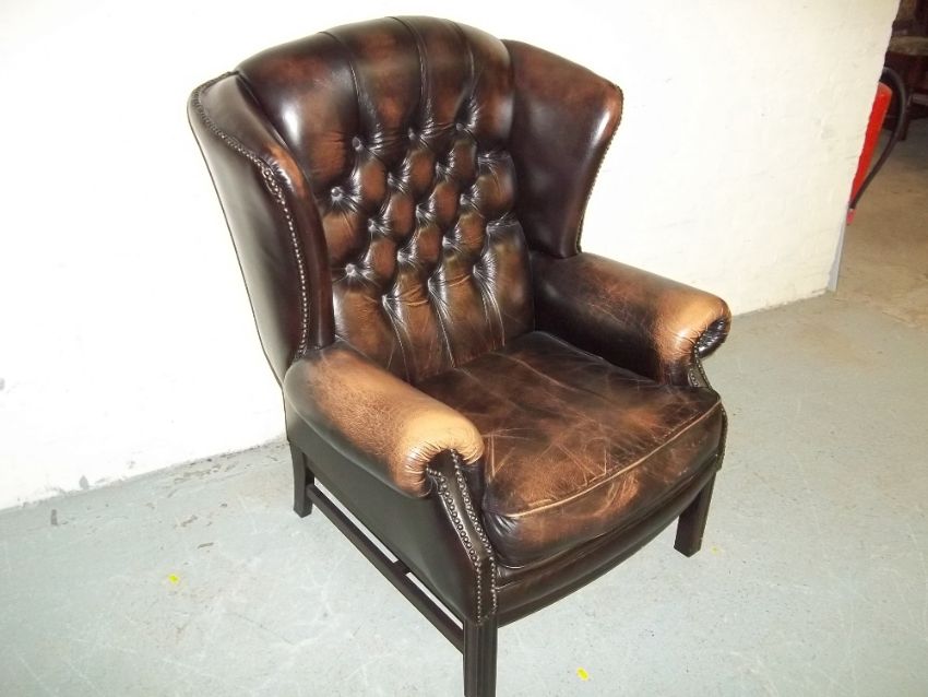 A BROWN LEATHER WING BACK CHAIR