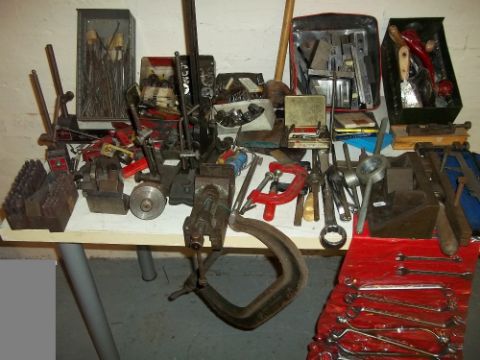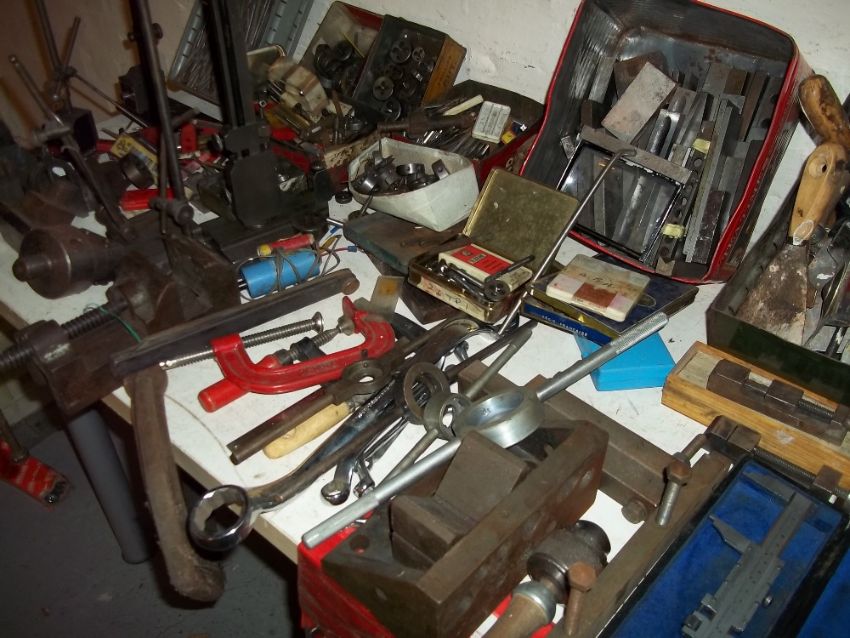 A LARGE SELECTION OF TOOLS TO INCLUDE AN ENGINEERING VICE, TAPS AND DIES