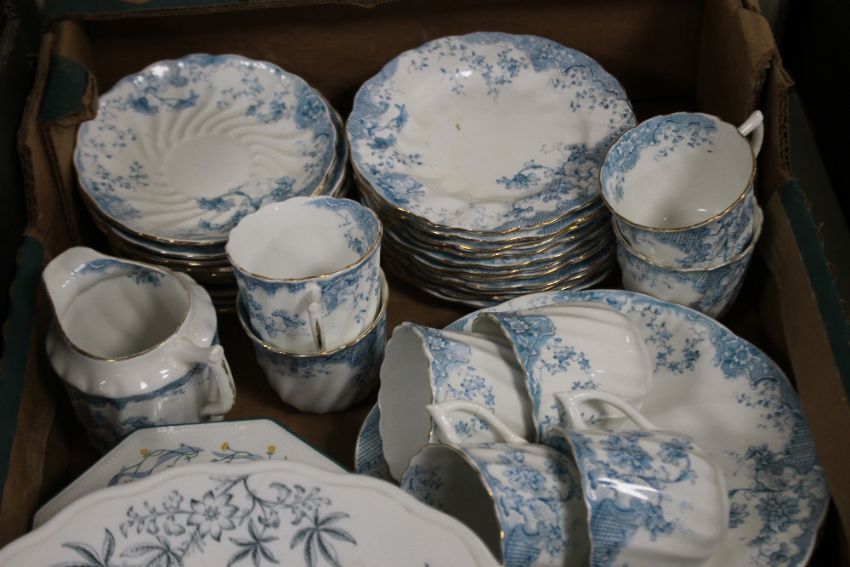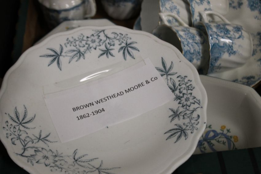 A TRAY OF CERAMICS TO INCLUDE A BROWN WESTHEAD MORE & CO. CAKE STAND, JOHNSONS BROTHERS ETC.