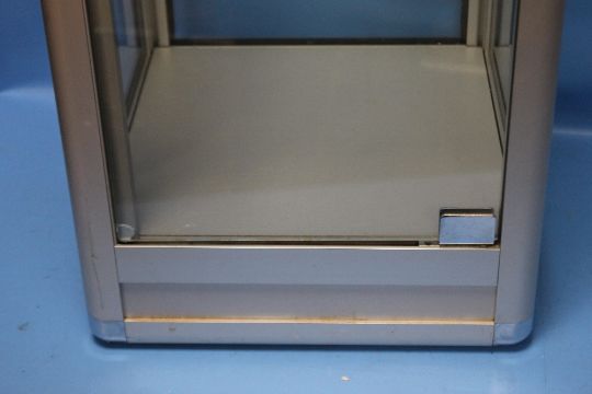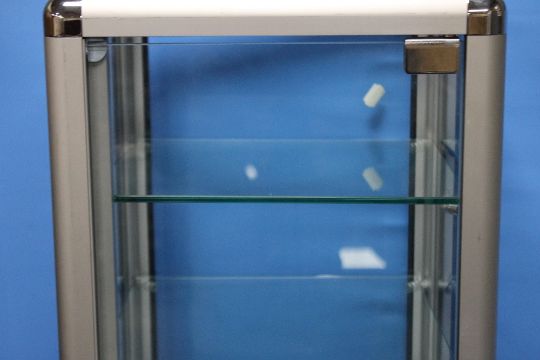 A GLAZED TABLE TOP DISPLAY CABINET WITH FITTED GLASS SHELVES, H 70 CM, W 36 CM D 36 CM