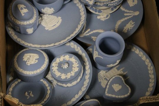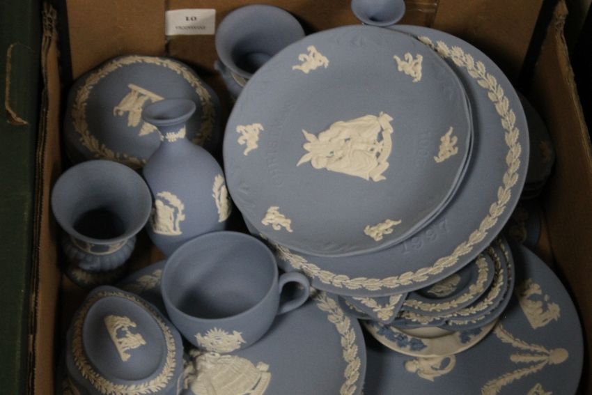 TWO TRAYS OF MAINLY BLUE & WHITE WEDGWOOD JASPERWARE TO INCLUDE PLAYING CARD EXAMPLES