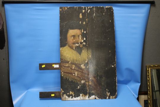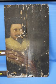 CIRCLE OF DANIEL MYTONS, 17TH CENTURY, PORTRAIT OF A MAN, HALF LENGTH WEARING A LARGE COLLAR, OIL ON PANEL (REDUCED), EXTENSIVE SURFACE FLAKING A/F, 63 X 77 CM