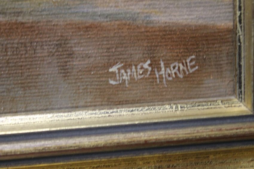 A FRAMED OIL ON CANVAS OF A SEASCAPE SIGNED JAMES HORNE, APPROX. 70 X 40 CM
