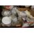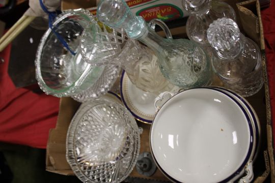 A TRAY OF CERAMICS TOGETHER WITH A TRAY OF GLASSWARE AND A FISHING ROD