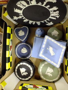A SMALL TRAY OF ASSORTED WEDGWOOD JASPERWARE TO INCLUDE A BLACK CABINET PLATE' TRINKET POTS ETC.