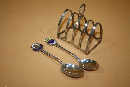 A HALLMARKED SILVER TOAST RACK TOGETHER WITH TWO ENAMEL SPOONS