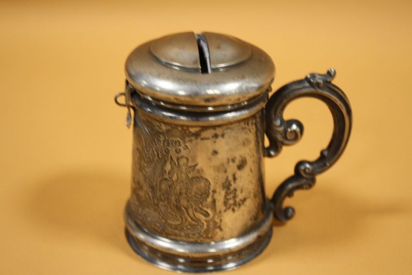 AN UNUSUAL ANTIQUE CONTINENTAL WHITE METAL MONEY BOX TANKARD DATED 1852