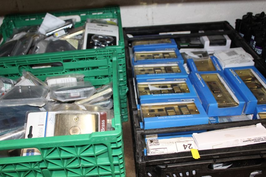 EIGHT TRAYS OF ELECTRICALS ETC TO INCLUDE PLUG SOCKETS' DIMMER SWITCHES' SEALANT ETC