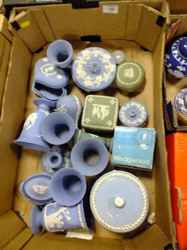 A TRAY OF ASSORTED WEDGWOOD JASPERWARE TO INCLUDE TRINKET POTS' SMALL TEAL VASE' GREY RING POT ETC.