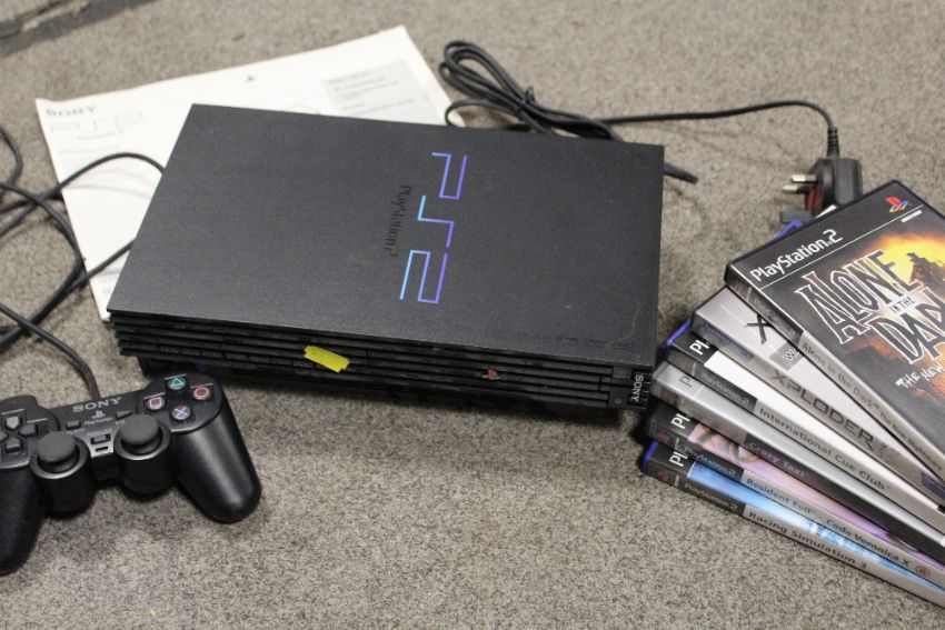A PS2 CONSOLE AND GAMES CONTROLLER