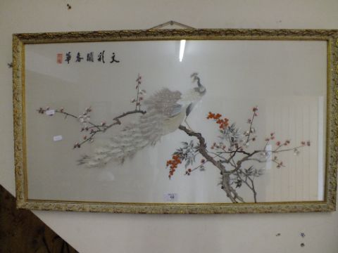 A GILT FRAMED AND GLAZED ORIENTAL NEEDLEWORK ON SILK DEPICTING A PEACOCK ON A BRANCH OVERALL SIZE INCLUDING FRAME - 91CM X 49CM APPROX