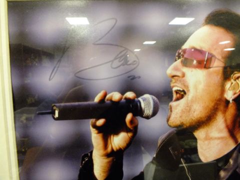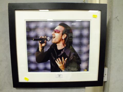 A FRAMED AND GLAZED U2 INTEREST SIGNED PHOTOGRAPH OF BONO