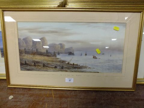 A FRAMED AND GLAZED WATERCOLOUR ENTITLED ,THE OLD CHAIN PIER' BRIGHTON, SIGNED E. EARP OVERALL SIZE INCLUDING FRAME - 64CM X 38.5CM APPROX