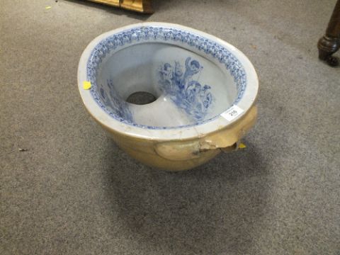 AN ANTIQUE BLUE AND WHITE BIDET BOWL? WITH CHERUBIC DETAIL A/F