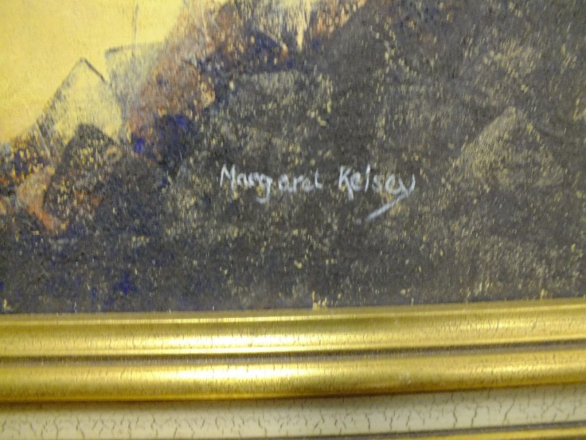 A LARGE GILT FRAMED IMPRESSIONIST OIL ON CANVAS DEPICTING A SEASCAPE AT SUNRISE SIGNED MARGARET KELSEY OVERALL SIZE INCLUDING FRAME - 105CM X 65CM APPROX