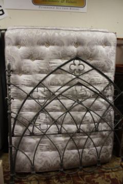 A MODERN GOTHIC STYLE METAL KINGSIZE HEADBOARD AND FOOTBOARD WITH MATTRESS AND DIVAN BASE
