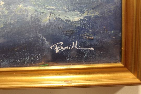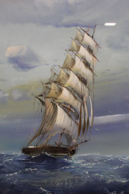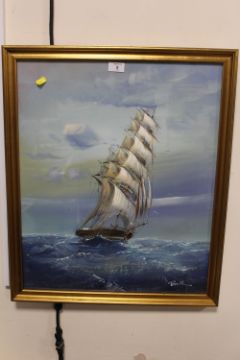 BAILLE - A GILT FRAMED AND GLAZED OIL BOARD DEPICTING A SHIP AT SEA SIGNED LOWER RIGHT OVERALL SIZE INCLUDING FRAME - 67CM X 57CM APPROX