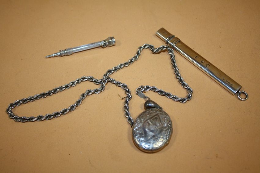 A COLLECTION OF SILVER COLLECTABLES TO INCLUDE A LARGE OVAL LOCKET ON CHAIN' PROPELLING PENCIL ETC.