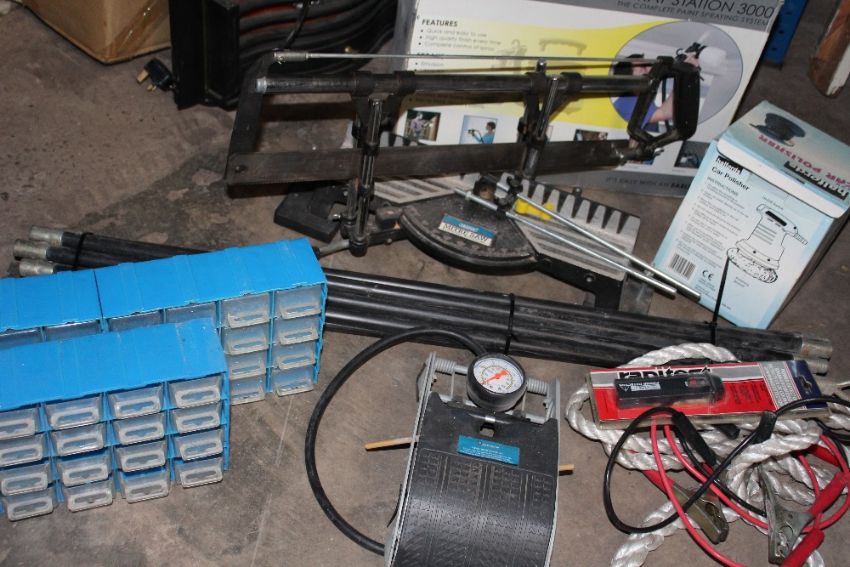 A MITRE SAW' DRAIN RODS'SPRAY STATION ETC