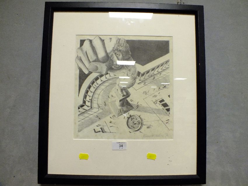 A FRAMED AND GLAZED 1973 SIGNED PRINT OF A STATUE FROM A BIRDS EYE VIEW BY KLAUS VOORMANN (SEE VERSO)