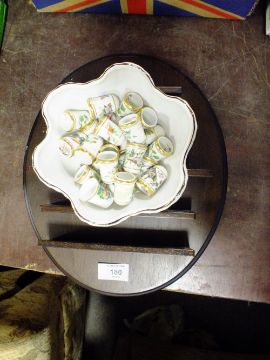 A COLLECTION OF FRANKLIN PORCELAIN THIMBLES ON WOODEN DISPLAY STAND