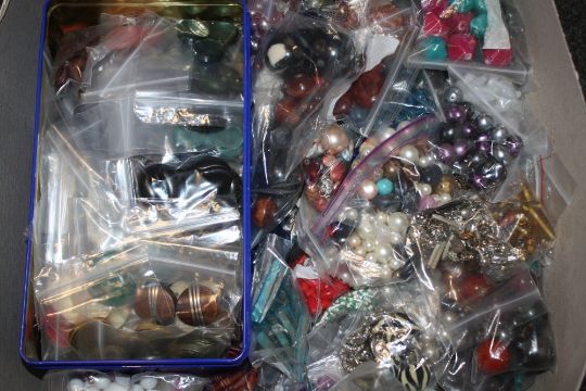 A BOX OF ASSORTED COSTUME JEWELLERY BEADS & BUTTONS ETC