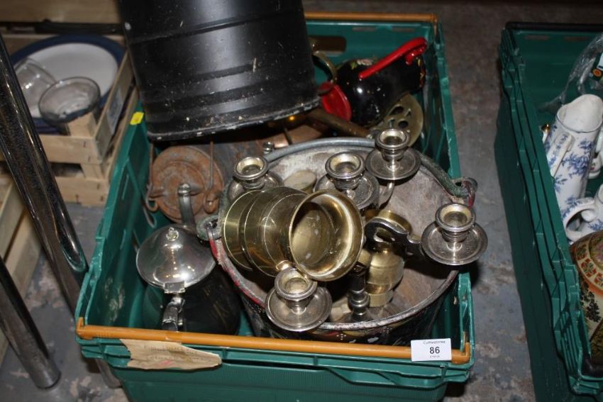 A TRAY OF ASSORTED METALWARE TO INCLUDE A PAINTED COAL BUCKET, CANDELABRA & COPPER KETTLE ETC