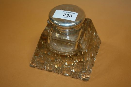 A LARGE HEAVY CUT GLASS DESK INKWELL WITH HALLMARKED SILVER MOUNTS - LONDON 1909