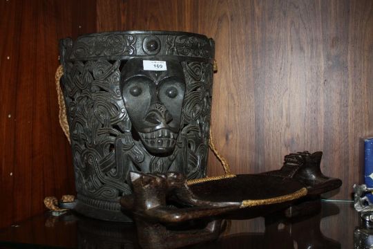 AN INDONESIAN TRIBAL ART DAYAK BORNEO BABY CARRIER TOGETHER WITH A TWIN HANDLED TREEN BOWL