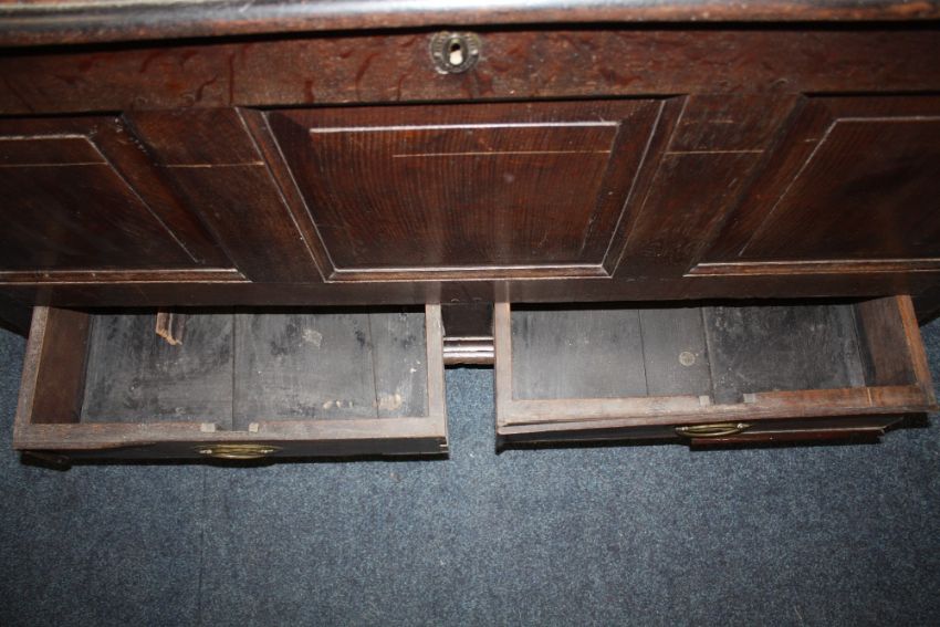 AN ANTIQUE OAK PANELLED MULE CHEST, the original hinged lid above a tripe panel front and two drawers below, H 77 cm, W 124 cm S/D